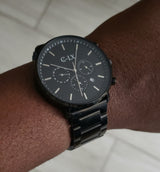 The Black Regal is surely a conversation starter. It features a stainless steel case and caseback. It has a polished stainless steel quick release band with butterfly closure. Dial features 3 sub dials and date with 6 hand movement.